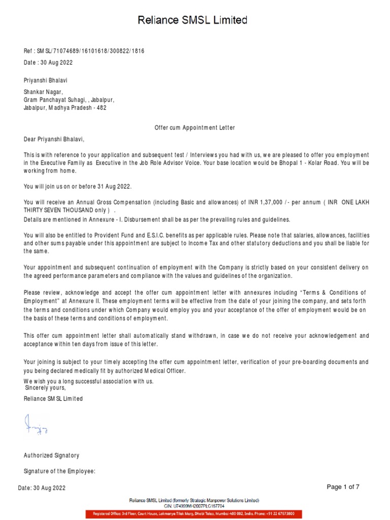 Offer cum Appointment Letter