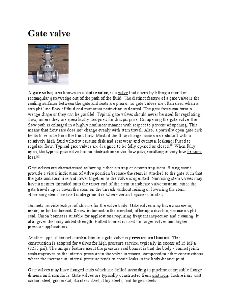 A gate valve, also known as a sluice valve, is a valve that opens by lifting a round or rectangular gate/wedge out of the path of the fluid. The distinct feature of a gate valve is the sealing surfaces between the gate and seats are planar, so gate valves are often used when a straight-line flow of fluid and minimum restriction is desired. The gate faces can form a wedge shape or they can be parallel. Typical gate valves should never be used for regulating flow, unless they are specifically designed for that purpose. On opening the gate valve, the flow path is enlarged in a highly nonlinear manner with respect to percent of opening. This means that flow rate does not change evenly with stem travel. Also, a partially open gate disk tends to vibrate from the fluid flow. Most of the flow change occurs near shutoff with a relatively high fluid velocity causing disk and seat wear and eventual leakage if used to regulate flow. Typical gate valves are designed to be fully opened or closed.[1] When fully open, the typical gate valve has no obstruction in the flow path, resulting in very low friction loss.[2] Gate valves are characterised as having either a rising or a nonrising stem. Rising stems provide a visual indication of valve position because the stem is attached to the gate such that the gate and stem rise and lower together as the valve is operated. Nonrising stem valves may have a pointer threaded onto the upper end of the stem to indicate valve position, since the gate travels up or down the stem on the threads without raising or lowering the stem. Nonrising stems are used underground or where vertical space is limited. Bonnets provide leakproof closure for the valve body. Gate valves may have a screw-in, union, or bolted bonnet. Screw-in bonnet is the simplest, offering a durable, pressure-tight seal. Union bonnet is suitable for applications requiring frequent inspection and cleaning. It also gives the body added strength. Bolted bonnet is used for larger valves and higher pressure applications. Another type of bonnet construction in a gate valve is pressure seal bonnet. This construction is adopted for valves for high pressure service, typically in excess of 15 MPa (2250 psi). The unique feature about the pressure seal bonnet is that the body - bonnet joints seals improves as the internal pressure in the valve increases, compared to other constructions where the increase in internal pressure tends to create leaks in the body-bonnet joint. Gate valves may have flanged ends which are drilled according to pipeline compatible flange dimensional standards. Gate valves are typically constructed from cast iron, ductile iron, cast carbon steel, gun metal, stainless steel, alloy steels, and forged steels.