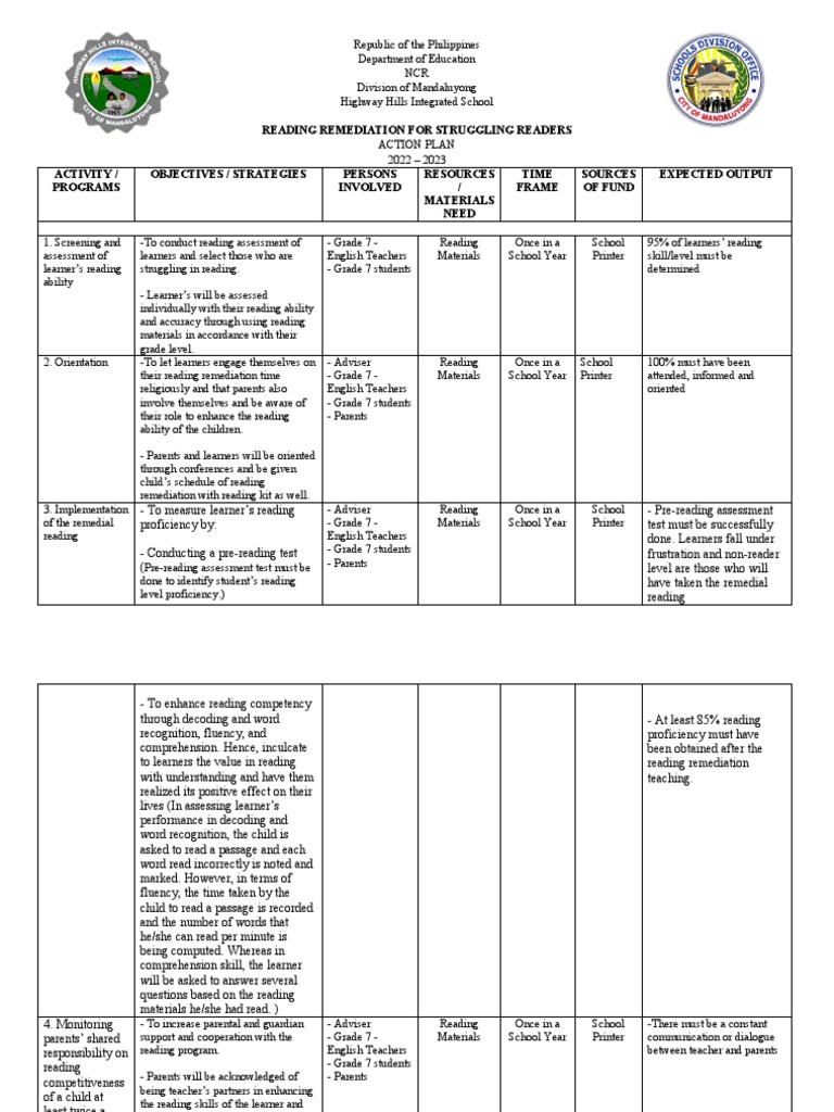 their reading remediation time - Grade 7 - Materials School Year Printer attended, informed and