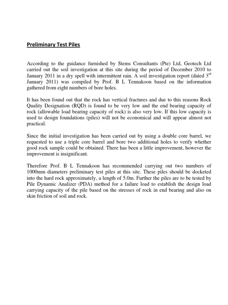 According to the guidance furnished by Stems Consultants (Pte) Ltd, Geotech Ltd carried out the soil investigation at this site during the period of December 2010 to January 2011 in a dry spell with intermittent rain. A soil investigation report (dated 3rd January 2011) was compiled by Prof. B L Tennakoon based on the information gathered from eight numbers of bore holes. It has been found out that the rock has vertical fractures and due to this reasons Rock Quality Designation (RQD) is found to be very low and the end bearing capacity of rock (allowable load bearing capacity of rock) is also very low. If this low capacity is used to design foundations (piles) will not be economical and will appear almost not practical. Since the initial investigation has been carried out by using a double core barrel, we requested to use a triple core barrel and bore two additional holes to verify whether good rock sample could be obtained. There has been a little improvement, however the improvement is insignificant. Therefore Prof. B L Tennakoon has recommended carrying out two numbers of 1000mm diameters preliminary test piles at this site. These piles should be docketed into the hard rock approximately, a length of 5.0m. Further the piles are to be tested by Pile Dynamic Analizer (PDA) method for a failure load to establish the design load carrying capacity of the pile based on the stresses of rock in end bearing and also on skin friction of soil and rock.