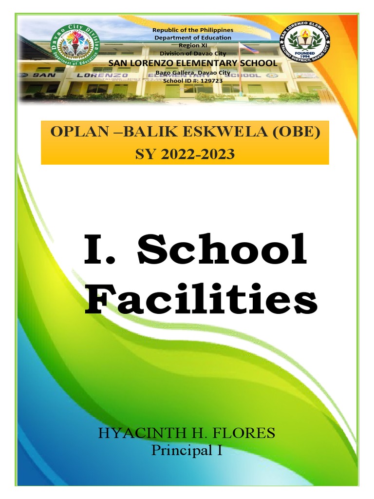 The document outlines the OPLAN – BALIK ESKWELA (OBE) for the school year 2022-2023 at San Lorenzo Elementary School in Davao City. It is issued by the Department of Education, Region XI. The principal of the school is Hyacinth H. Flores.