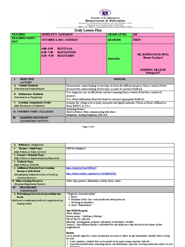 TEACHER GENELYN T. GAWARAN GRADE LEVEL SIX