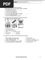 because Im usually hungry 4 Idont GAY. ee Doe Gp SO early in the morning. 5 Weboften...yeok...) at ‘my grandparents’ house on Sunday evening. My grandmother is a very good cook. {6 Atthe weekend, | often go out in the evening and then ches ES late. 7. Before an exam, | Smetimes hone...\ledmt 1 Most British children g 2% when they are five years old 2 thous b: | 2.5 at about 7 o'clock every morning, 3 lalwayss 4 wdy wih \a Pec ca before a mathsexam. 0 \ 4 It’sa beautiful day. Let's w sd. ta® doc. 5 My family and ih 9.8.8 dv. ££ at about 8 o'clock in the evening. ee 7 Ties selealMMAR © Present Simple affirmative Bl Complete the sentences with the verbs in brackets: Use the Present Simple affirmative, Then lookat the @Pieture of Kens room and tick ()T (true) oF fase: re Bc, comet ie tidy his _ '5 Ken and his friend never (eat) in his room. k 6 Ken OWSIAENwatch) TV in his room. 4 Ken (go) to Brendan School 2 Kennever WS lEe'wstem tomusicinhisroom. | 4 Ken (tidy) his room every day a Complete etext withthe vrs in brackets the Present Simple: Most students at Pil Schoolin Cina... Qi0& | 2 gas esa ry Ail student 2. have) meals at school and | aes ‘5. {study) with other students in the | Sere (go) home for | slosh hisver ng and dificult, Infact, some students® 248.5 __ (walk fortwo daysto get home. ‘ter each school holiday, ateacher® ca’®™ (come) tocach student’ vilage to help him or her return to school (lve) ® choose the correct adverb of frequency according to the ‘7 information in the text in Exercise’3s 1 Students from Pili never / rarely / usually study far from home. 2 While studying, the students sometimes / never / always have lunch at home. 3 Students usually / never / rarely stay at school at night. 4 Students never / rarely /aften.qo home for school holidays, 5 Students rarely / usually / often walk to school - only after schoo! holidays. [5 complete the sentences so they are true for you. YY Use the Present Simple affirm 1. On Saturdays, | USM, 2 ny iendsoten UNE RS Kh the 3 Mymother never WNQ0® Lowel casks, 4 Myteacher usually SEONG, 1 bal . S. ec 5 Mybes friend and | sometimes C SPEAKING © Talking about routines 16! complete the dialogue with the words below. two houts | always | atnight | moming | at 7.00 ‘As Lusually get up * 08. £:09. Vhavea shower every ? ct . “BE Really? Not me.1*..haots9. get up at 7.30. Ihave a shower in the evening, HORS watch TV fort fuse... SOUS and then i goto bed at 11 o'clock. earn es og before go to bed.VOCABULARY © Activities BR write the activities under the correct pictures. Use al the words below. ride { play | to | messages | cinema ! the | send ! listen 1 magazines | friends | a | go ! guitar { read | play! music | the | meet ! bike | games } to computer BBE match the descriptions in A to the activities. Complete the sentences with the activities below. pees YY download songs | surftheweb | meet friends | goto the cine a play the guitar | ridea bike 1 look for information on the Internet 1 My friends and Ising in our 2 find music onthe Internet and save't on rockband your computer 2 Once a month, we. ‘to watch a film. 3 create short flms 3 loften by Coldplay. 4 talk to a friend on the Internet Jove their songs. 5 play football or tennis 4 Jusually. ‘to school. 6 use your phone to write to a friend 5 |sometimes. aaa to find information rears for school projects. 6 Twice aweek, I = We always: 8 have fun together. L ao a ‘Add adverbs of frequency and complete the sentences 'V¥ so they are true for you. go shopping 1 ae PfRicorfekne goes download songs o e make videos 21 meet friends and we f surfthe web = g chat online Ble surf the web for chat online withMMAR € Present Simple negative and interrogative Write sentences with the words in brackets. Use the 7 Present Simple negative. 1 My bestfriend studies English on Mondays. (on Tuesdays) 2 |read books. (magazines) 3 We eat snacks during the break. (during our lessons) 4 The maths teacher gives tests once a month, {every week) 5 The students do sport in the afternoon. {in the moming) Look at the results of a survey. Then complete the sentences below with the verbs in brackets. Use the Present Simple affirmative or negative. WHAT DO TEENS. INYEAR 8 SPEND THEIR TIME ON? wll s ja 19. | 20 | SoBe tos ez “Number ofsents: 20 boys and'20 gis 1 Allthe boys (listen) to music. 2 One git in the class (end) messages. 3 One boy in the class (surf) the web. 4 Almostall the boys and girls. (watch) TV. 5 Boys (often read) magazines. 6 One gil. (chat) online only once or twice aweek BBE write questions with the words below. Use YT" the Present Simple. Then answer the questions according to the survey results in Exercise 2. 1 girls /often / surf the web 2 what/one girl /often /do 3. how many times a week /a typical student / watch TV 4-how often / most of the gitls /listen to music 5 any boys /read magazines, BH) write two more questions (Q) about students in the ‘Y¥¥ survey in Exercise 2 and answer (A) your questions. 1@ A SPEAKING € Talking about activities BBE complete the dialogue with the phrases below, enjoy it } what after-school activities wheredo | who do you do you do? do you play how often Joe * Scott: | play the guitar with friends. Joe > Scott: Three times a week. Joe: When® ? Scott: On Tuesdays, Thursdays and Fridays, Joe: * play with? Seott: John and Sally Joe: * Scott: At Sally’ house. Joe: Doyou® ? Scott: Yes, Ido do you play? you play?WRITING © A description of teen life BBY correct the sentences below by adding the correct capital letters. 1 my friends and play basketball on wednesday evenings. 4 they are english. 5 my favourite holiday is christmas. 2 kate loves the film mission impossible with tom cruise. 3. iwant to go to the usa in july [BE Write the following sentences with the correct punctuation. 1 Doyoulike sport 2. We've got a dog a cat anda fish 3 Charles hasnt got abig family 4 Thats Janes house 5 Welove London BBE Read the descr