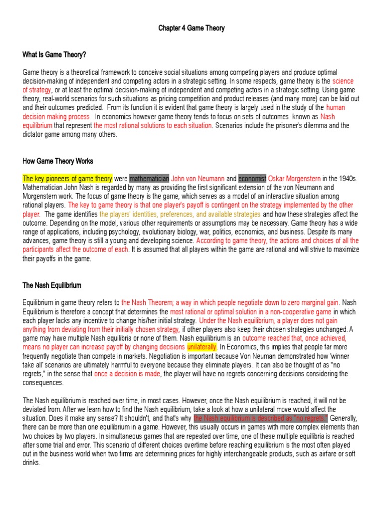 equilibrium that represent the most rational solutions to each situation. Scenarios include the prisoner's dilemma and the