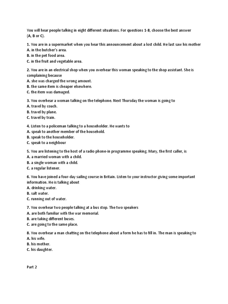 You will hear people talking in eight different situations.
