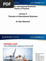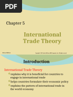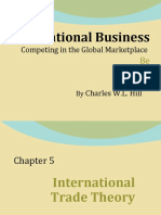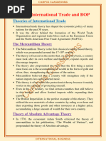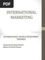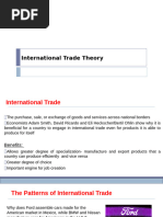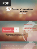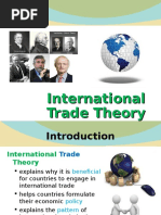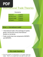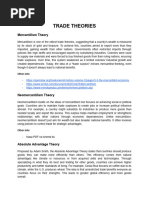1. INTERVENTIONIST THEORIES Export or import of a country is totally or largely controlled by government. 1.1. MERCANTILISM This theory formed the foundation of economic though from about 1500-1800 BC. According to the theory, countries should export more than they import and, if successful, receive gold from countries that run deficits. 1.2. NEOMERCANTILISM A country that practices neomercantilism attempts to run an export surplus to achieve a social or political objective. For instance, a country may try to achieve full employment by setting economic policies that encourages its companies to produce in excess of demand at home and to send the surplus abroad. 2. FREE TRADE THORIES 2.1. ABSOLUTE ADVANTAGE THEORY Smith developed the theory of absolute advantage, which holds that different countries produce some goods more efficiently than other countries; thus global efficiency can increase through free trade. For example, if a country A produce rice more efficiently than country B and Country B produce wheat more efficiently than country A; Then according to Adam Smiths absolute advantage theory, country A will produce only rice and country B will produce only wheat. Country A will import wheat from country B and in the same way country B will import rice from country A. Through specialization, countries could increase their efficiency because of three reasons: 1. Labor could become skilled by repeating the same tasks. 2. Labor would not lose time in switching from the production of one kind of product to another. 3. Long production runs would provide incentives for the development of more effective working methods. Free trade will bring: Specialization Greater efficiency Higher global output Although Smith believed the marketplace would make the determination, he thought that a countrys advantage would be either natural or acquired. 2.1.1. NATURAL ADVANTAGE 1