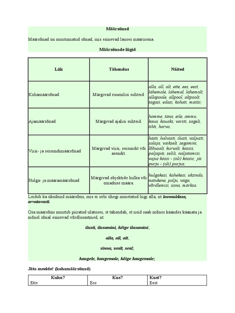 Harjutus 1. Valige loendist sobiv kohamäärsõna.