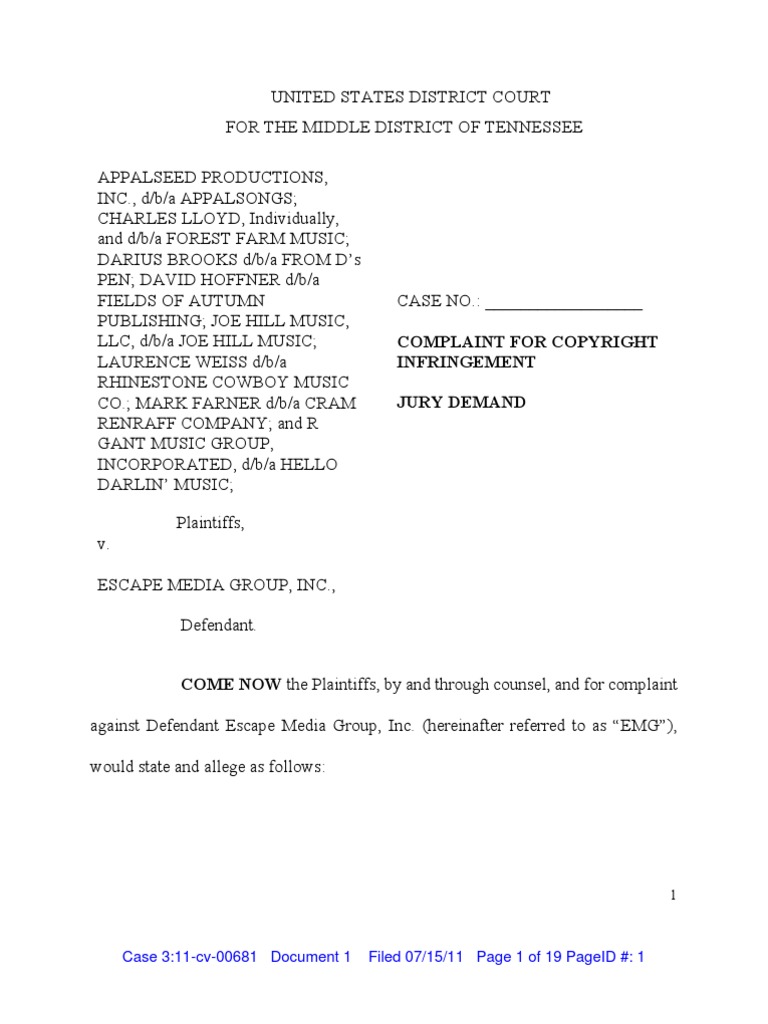 UNITED STATES DISTRICT COURT FOR THE MIDDLE DISTRICT OF TENNESSEE APPALSEED PRODUCTIONS, INC., d/b/a APPALSONGS; CHARLES LLOYD, Individually, and d/b/a FOREST FARM MUSIC; DARIUS BROOKS d/b/a FROM D’s PEN; DAVID HOFFNER d/b/a FIELDS OF AUTUMN PUBLISHING; JOE HILL MUSIC, LLC, d/b/a JOE HILL MUSIC; LAURENCE WEISS d/b/a RHINESTONE COWBOY MUSIC CO.; MARK FARNER d/b/a CRAM RENRAFF COMPANY; and R GANT MUSIC GROUP, INCORPORATED, d/b/a HELLO DARLIN’ MUSIC; Plaintiffs, v. ESCAPE MEDIA GROUP, INC., Defendant. CASE NO.: __________________