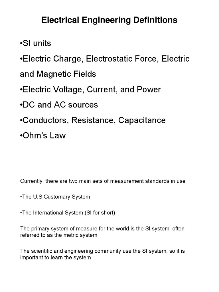 Electrical Engineering Definitions SI units Electric Charge, Electrostatic Force, Electric and Magnetic Fields Electric Voltage, Current,