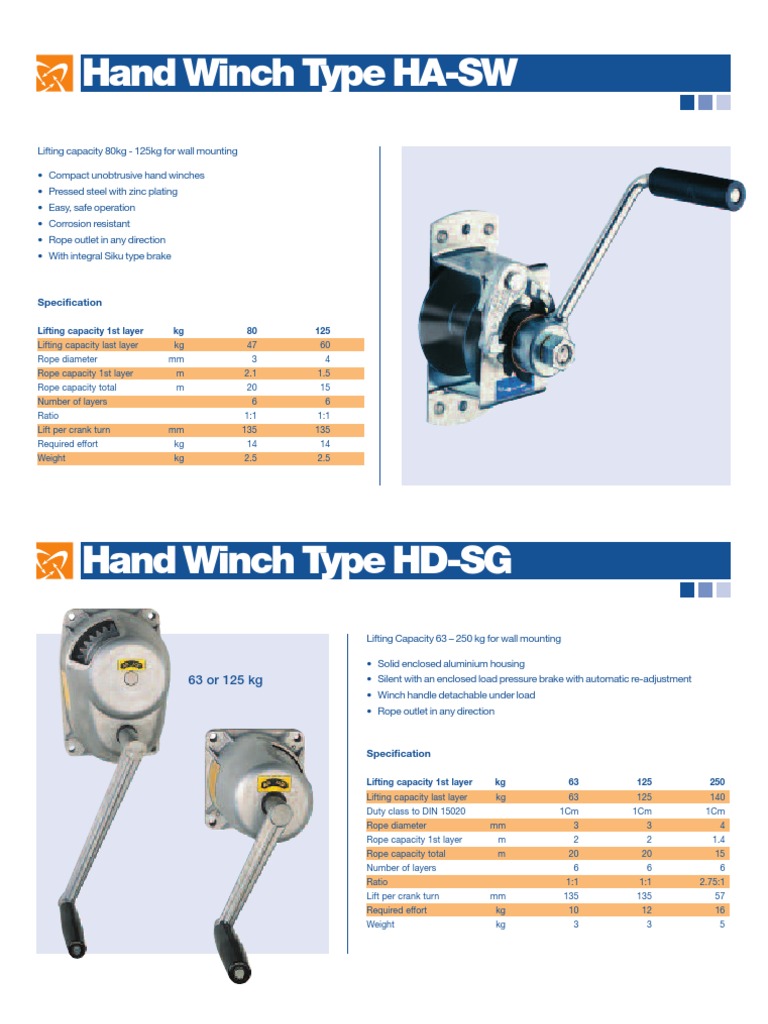 Lifting capacity 80kg - 125kg for wall mounting Compact unobtrusive hand winches Pressed steel with zinc plating Easy, safe operation Corrosion resistant Rope outlet in any direction With integral Siku type brake