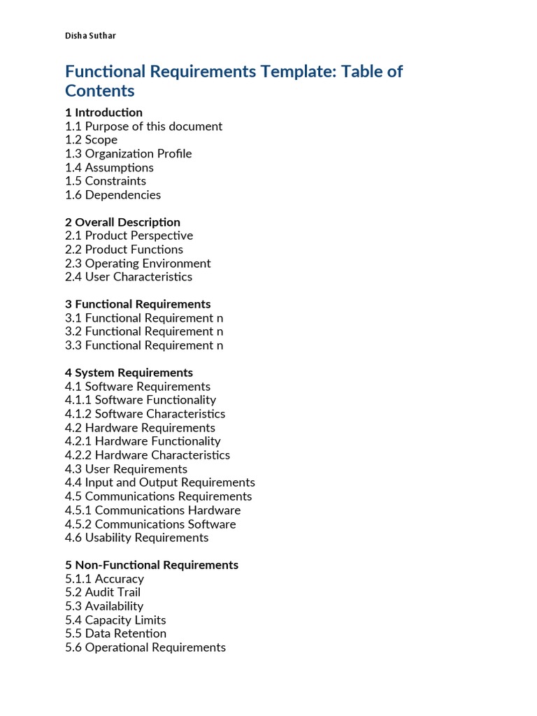 Functional Requirements Template: Table of