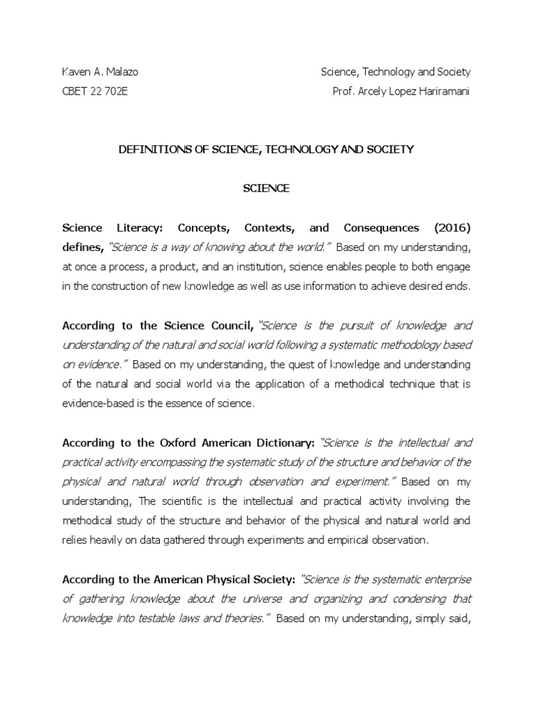DEFINITIONS OF SCIENCE, TECHNOLOGY AND SOCIETY