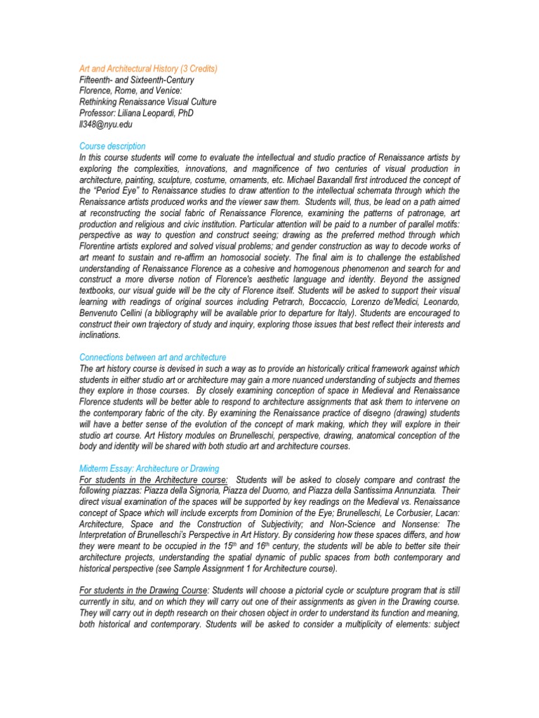 matter, patron, artist, context, religious narrative, social narrative; gender construction, etc. According to the selected object, research will encompass the reading of the latest articles as available through the digital database JSTOR. Final Research Paper: Architecture AND Drawing All students will be asked to write a final research paper of no less than 10 pages that makes use of primary sources to closely examine a chosen work of art, artist or concept. Papers that compare features of the Florentine Renaissance to either the Venetian or the Roman Renaissance are particularly encouraged, as this approach will allow students to fully mature their direct experiences of those cities. Students will be asked to use a minimum of seven sources, two primary and five secondary, and give evidence of their grasp of the various scholarly interpretations on their chosen subject. The final goal of the project is to foster critical thinking and writing skills, enabling the students to understand art and architecture within an evolving and dynamic socio-economic context that also includes our own time.