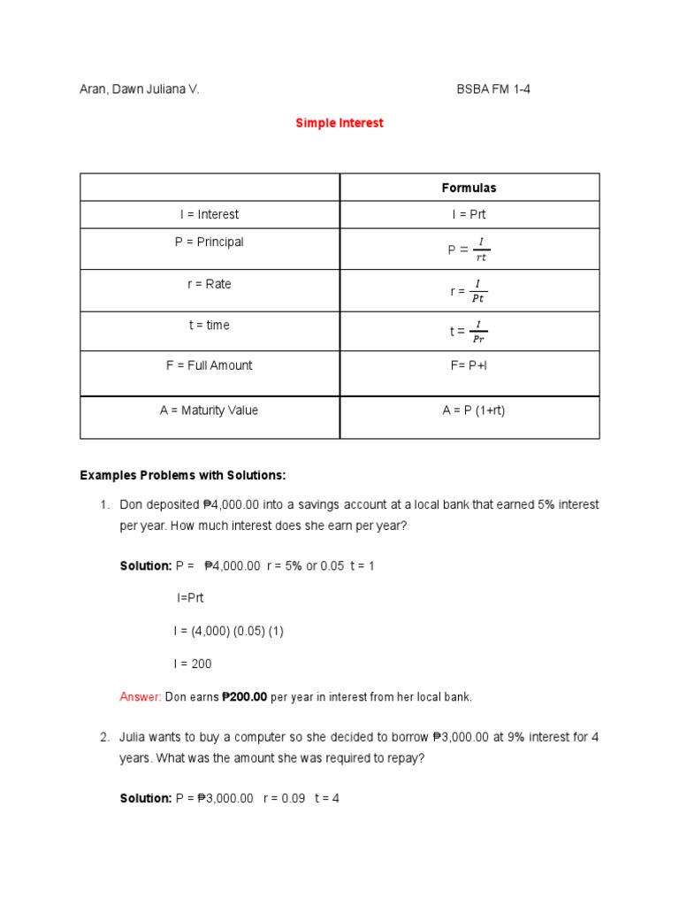 Solution: P = ₱5,000.00 r = 4% or 0.04 t = 2