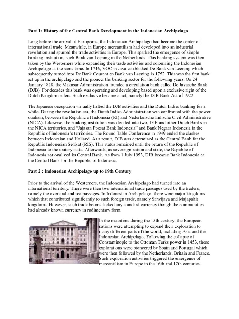 Part 1: History of the Central Bank Development in the Indonesian Archipelago Long before the arrival of Europeans, the