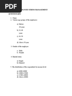 15. ARE YOU ABLE TO BUILD A BALANCE BETWEEN WORK LIFE AND PERSONAL LIFE? A. Strongly Agree B. Agree C. Neutral D. Disagree E. Strongly Disagree OPEN ENDED QUESTIONNAIRE 1. What does stress mean to you? 2. What steps have you taken to reduce stress at your work place? 3. What steps have been implemented to improve working conditions of the employees? 4. Do your employees approach you with their issues and do you resolve them? Justify. 5. What steps have you taken to know the prevailing conditions of the employees? 6. Do you face similar stress conditions that your employees face at work? What do you do to reduce such conditions? 7. What is the severity level of importance you consider for the welfare of your employees where 1 being the lowest and 9 being the highest? 8. Do you feel that the existing manpower is enough to meet the work demands in your organization? 9. Does stress at work affect your output? 10. Do you feel the policies of your company cause stress among the employees? 11. Do you feel that leadership styles cause stress among the employees? 12. Do your employees face any physical or emotional ailments in common? What steps have you taken to avoid this? 13. Have you noticed stress warning signs in your company? Example: Mood and behavior changes Health complaints Absenteeism Indecisiveness Reduced performance Deteriorating relationships If yes, why? What have you done in such situations?