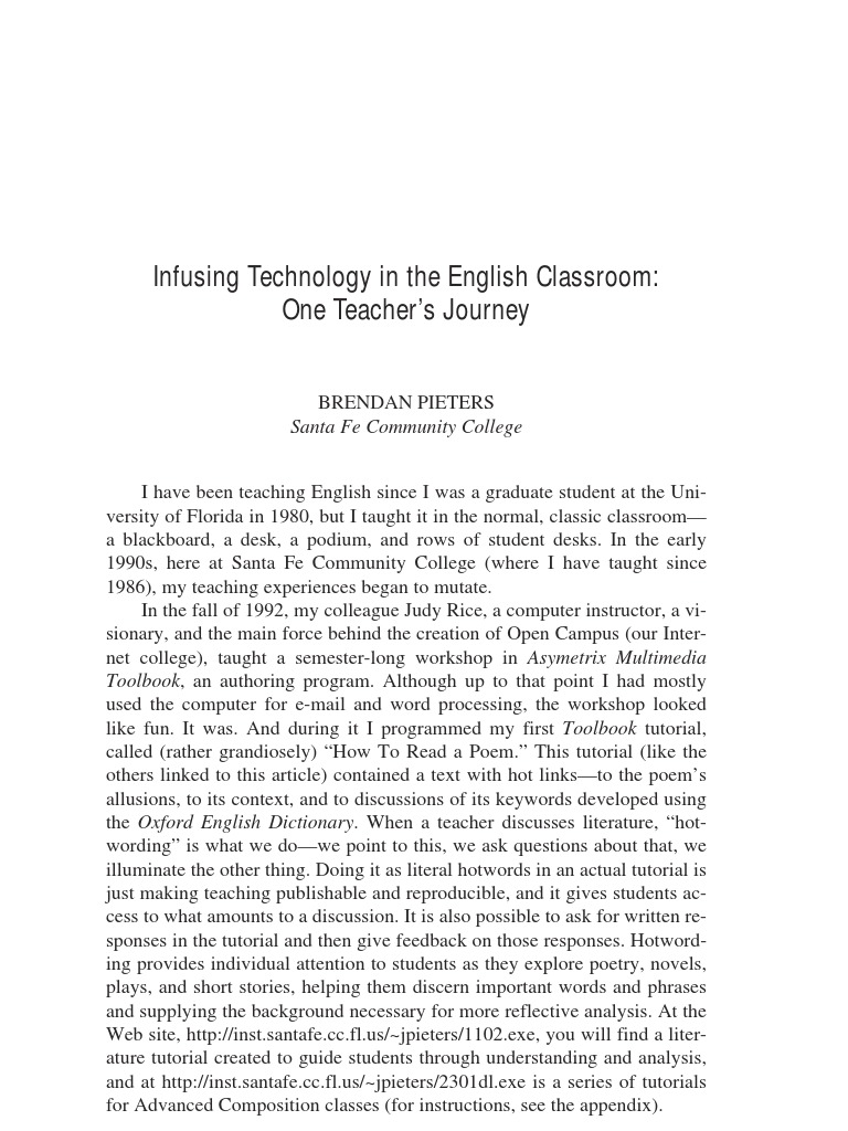 BRENDAN PIETERS Santa Fe Community College I have been teaching English since I was a graduate student at the University of Florida in 1980, but I taught it in the normal, classic classroom a blackboard, a desk, a podium, and rows of student desks. In the early 1990s, here at Santa Fe Community College (where I have taught since 1986), my teaching experiences began to mutate. In the fall of 1992, my colleague Judy Rice, a computer instructor, a visionary, and the main force behind the creation of Open Campus (our Internet college), taught a semester-long workshop in Asymetrix Multimedia Toolbook, an authoring program. Although up to that point I had mostly used the computer for e-mail and word processing, the workshop looked like fun. It was. And during it I programmed my first Toolbook tutorial, called (rather grandiosely) How To Read a Poem. This tutorial (like the others linked to this article) contained a text with hot linksto the poems allusions, to its context, and to discussions of its keywords developed using the Oxford English Dictionary. When a teacher discusses literature, hotwording is what we dowe point to this, we ask questions about that, we illuminate the other thing. Doing it as literal hotwords in an actual tutorial is just making teaching publishable and reproducible, and it gives students access to what amounts to a discussion. It is also possible to ask for written responses in the tutorial and then give feedback on those responses. Hotwording provides individual attention to students as they explore poetry, novels, plays, and short stories, helping them discern important words and phrases and supplying the background necessary for more reflective analysis. At the Web site, http://inst.santafe.cc.fl.us/~jpieters/1102.exe, you will find a literature tutorial created to guide students through understanding and analysis, and at http://inst.santafe.cc.fl.us/~jpieters/2301dl.exe is a series of tutorials for Advanced Composition classes (for instructions, see the appendix).