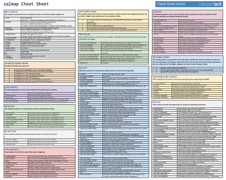 The sqlmap command will not run without at least one of these options added to it. This option dictates the volume of tests to perform and the extent of the feedback that they will The following options can be used to specify which parameters to test for, provide custom