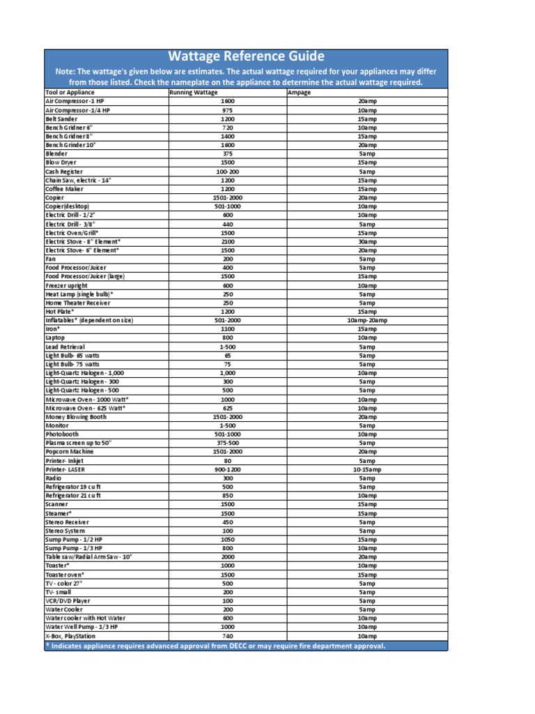 Wattage Reference Guide