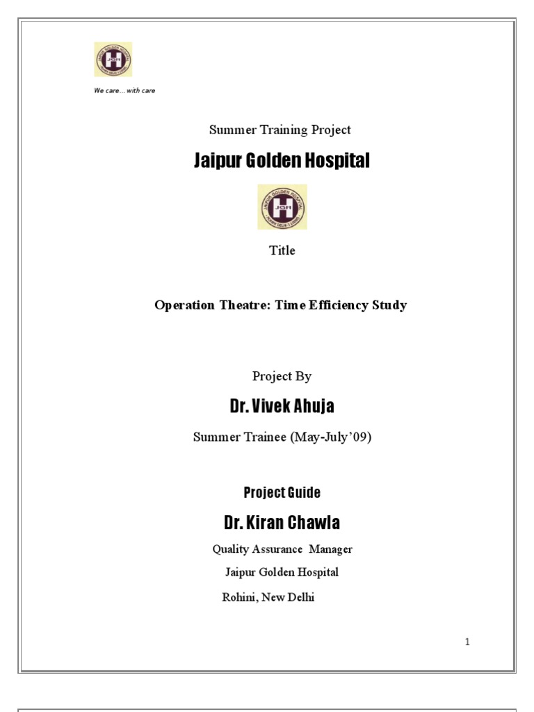 I would begin my acknowledgements by thanking the Medical Superintendent, Dr. Ashish Chandra, for initiating this study. I am also grateful to my guide, Dr. Kiran Chawla, Quality Assurance Manager, without whose support and guidance, this project would not have been possible. It was a great learning experience to work with such an experienced and knowledgeable mentor. I would also like to thank the management and all the employees of Jaipur Golden Hospital, New Delhi. for their support and constant encouragement throughout the project Special thanks to Dr.Ishwar Singh, Dr.Khushali Ratra, Dr. Ajay Singhal for going out of their way to help me with my project. Due thanks to my Institute UIAMS, Chandigarh and Dr. Jagandeep Singh, Coordinator, Placement cell, for providing me an opportunity to associate with an esteemed organization like Jaipur Golden Hospital, New Delhi. and constant guidance during the project with time, support and the much needed enthusiasm and inspiration. Special thanks to our Director, Prof. A.K. Saihjpal for his constant guidance and support. And my final thanks to my family and friends for their great moral support at all times during the project.