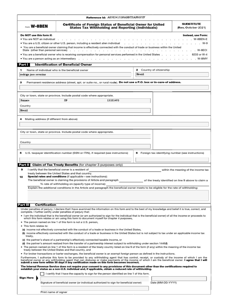 Form W-8BEN States Tax Withholding and Reporting (Individuals) (Rev. October 2021)
