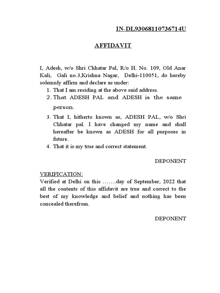 3. That I, hitherto known as, ADESH PAL, w/o Shri