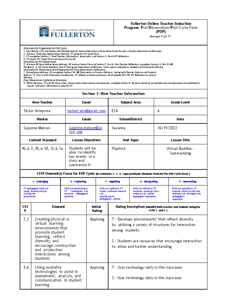 POP Cycle, Fullerton Online Teacher Induction Program (FOTIP), 2017. Adapted from CSU Fullerton Titan EDUCATOR Project, 2017. Page