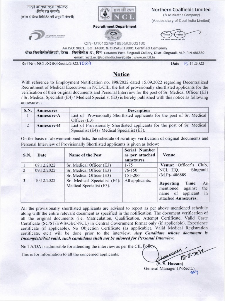 2 09.12.2022 Sr. Medical Officer (E3) 76-150 NCL H Q , Singrauli
