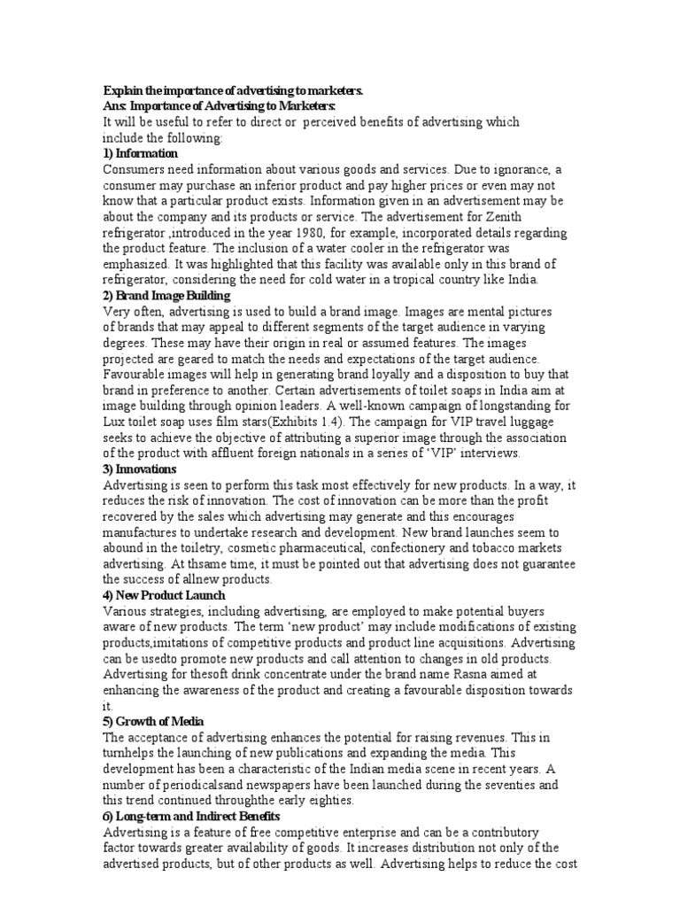 Ans: Importance of Advertising to Marketers: It will be useful to refer to direct or perceived benefits of advertising which include the following: 1) Information Consumers need information about various goods and services. Due to ignorance, a consumer may purchase an inferior product and pay higher prices or even may not know that a particular product exists. Information given in an advertisement may be about the company and its products or service. The advertisement for Zenith refrigerator ,introduced in the year 1980, for example, incorporated details regarding the product feature. The inclusion of a water cooler in the refrigerator was emphasized. It was highlighted that this facility was available only in this brand of refrigerator, considering the need for cold water in a tropical country like India. 2) Brand Image Building Very often, advertising is used to build a brand image. Images are mental pictures of brands that may appeal to different segments of the target audience in varying degrees. These may have their origin in real or assumed features. The images projected are geared to match the needs and expectations of the target audience. Favourable images will help in generating brand loyally and a disposition to buy that brand in preference to another. Certain advertisements of toilet soaps in India aim at image building through opinion leaders. A well-known campaign of longstanding for Lux toilet soap uses film stars(Exhibits 1.4). The campaign for VIP travel luggage seeks to achieve the objective of attributing a superior image through the association of the product with affluent foreign nationals in a series of VIP interviews. 3) Innovations Advertising is seen to perform this task most effectively for new products. In a way, it reduces the risk of innovation. The cost of innovation can be more than the profit recovered by the sales which advertising may generate and this encourages manufactures to undertake research and development. New brand launches seem to abound in the toiletry, cosmetic pharmaceutical, confectionery and tobacco markets advertising. At thsame time, it must be pointed out that advertising does not guarantee the success of allnew products. 4) New Product Launch Various strategies, including advertising, are employed to make potential buyers aware of new products. The term new product may include modifications of existing products,imitations of competitive products and product line acquisitions. Advertising can be usedto promote new products and call attention to changes in old products. Advertising for thesoft drink concentrate under the brand name Rasna aimed at enhancing the awareness of the product and creating a favourable disposition towards it. 5) Growth of Media The acceptance of advertising enhances the potential for raising revenues. This in turnhelps the launching of new publications and expanding the media. This development has been a characteristic of the Indian media scene in recent years. A number of periodicalsand newspapers have been launched during the seventies and this trend continued throughthe early eighties. 6) Long-term and Indirect Benefits Advertising is a feature of free competitive enterprise and can be a contributory factor towards greater availability of goods. It increases distribution not only of the advertised products, but of other products as well. Advertising helps to reduce the cost