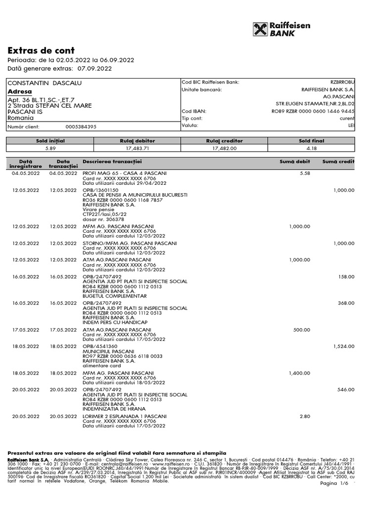 CONSTANTIN DASCALU Cod BIC Raiffeisen Bank: RZBRROBU