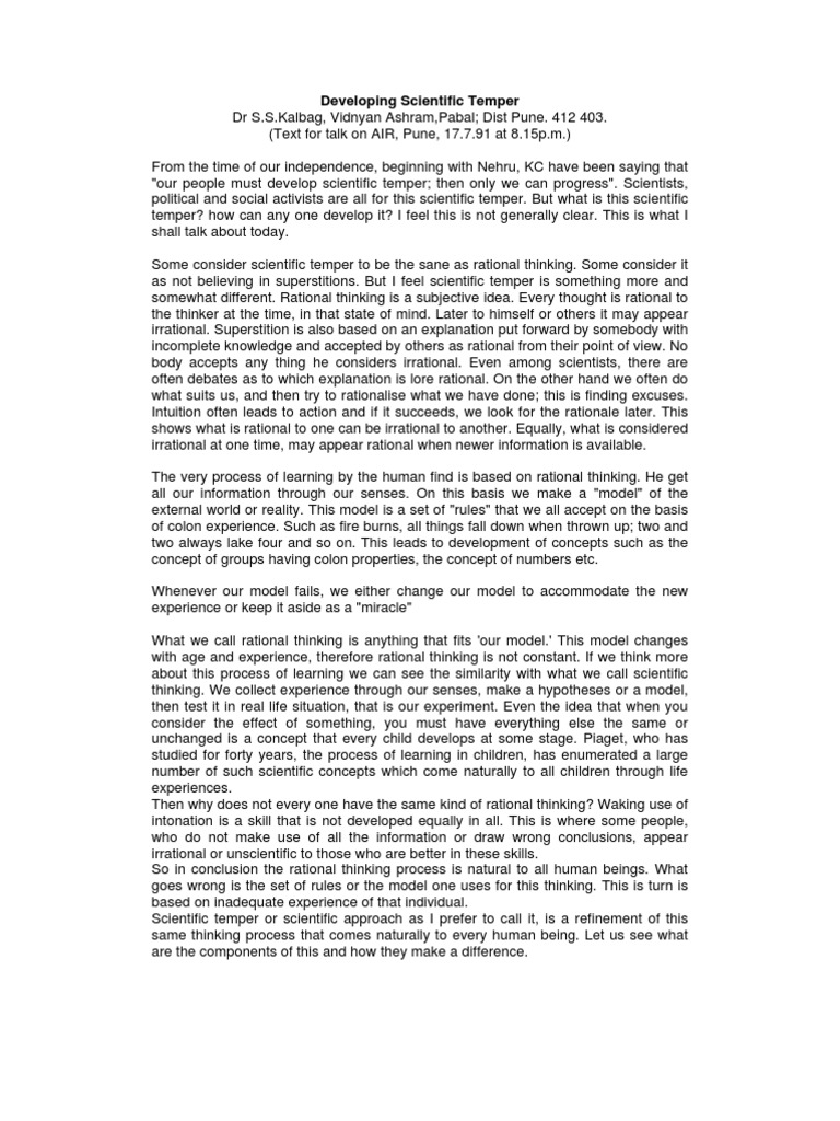 (Text for talk on AIR, Pune, 17.7.91 at 8.15p.m.) From the time of our independence, beginning with Nehru, KC have been saying that "our people must develop scientific temper; then only we can progress". Scientists, political and social activists are all for this scientific temper. But what is this scientific temper? how can any one develop it? I feel this is not generally clear. This is what I shall talk about today. Some consider scientific temper to be the sane as rational thinking. Some consider it as not believing in superstitions. But I feel scientific temper is something more and somewhat different. Rational thinking is a subjective idea. Every thought is rational to the thinker at the time, in that state of mind. Later to himself or others it may appear irrational. Superstition is also based on an explanation put forward by somebody with incomplete knowledge and accepted by others as rational from their point of view. No body accepts any thing he considers irrational. Even among scientists, there are often debates as to which explanation is lore rational. On the other hand we often do what suits us, and then try to rationalise what we have done; this is finding excuses. Intuition often leads to action and if it succeeds, we look for the rationale later. This shows what is rational to one can be irrational to another. Equally, what is considered irrational at one time, may appear rational when newer information is available. The very process of learning by the human find is based on rational thinking. He get all our information through our senses. On this basis we make a "model" of the external world or reality. This model is a set of "rules" that we all accept on the basis of colon experience. Such as fire burns, all things fall down when thrown up; two and two always lake four and so on. This leads to development of concepts such as the concept of groups having colon properties, the concept of numbers etc. Whenever our model fails, we either change our model to accommodate the new experience or keep it aside as a "miracle" What we call rational thinking is anything that fits 'our model.' This model changes with age and experience, therefore rational thinking is not constant. If we think more about this process of learning we can see the similarity with what we call scientific thinking. We collect experience through our senses, make a hypotheses or a model, then test it in real life situation, that is our experiment. Even the idea that when you consider the effect of something, you must have everything else the same or unchanged is a concept that every child develops at some stage. Piaget, who has studied for forty years, the process of learning in children, has enumerated a large number of such scientific concepts which come naturally to all children through life experiences. Then why does not every one have the same kind of rational thinking? Waking use of intonation is a skill that is not developed equally in all. This is where some people, who do not make use of all the information or draw wrong conclusions, appear irrational or unscientific to those who are better in these skills. So in conclusion the rational thinking process is natural to all human beings. What goes wrong is the set of rules or the model one uses for this thinking. This is turn is based on inadequate experience of that individual. Scientific temper or scientific approach as I prefer to call it, is a refinement of this same thinking process that comes naturally to every human being. Let us see what are the components of this and how they make a difference.