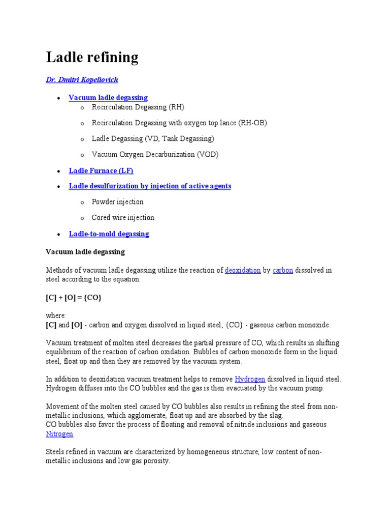 Ladle Furnace process is used for refining a wide variety of steels, in which degassing (hydrogen