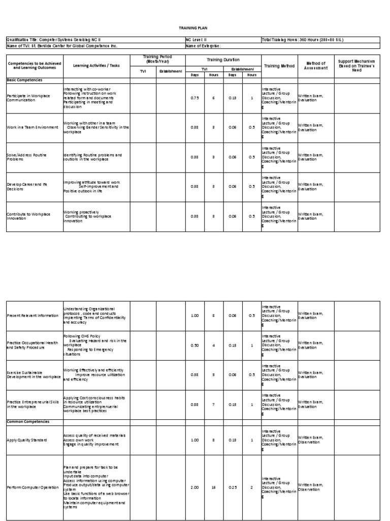 Qualification Title: Computer Systems Servicing NC II NC Level: II Total Training Hours: 360 Hours (280+80 SIL)