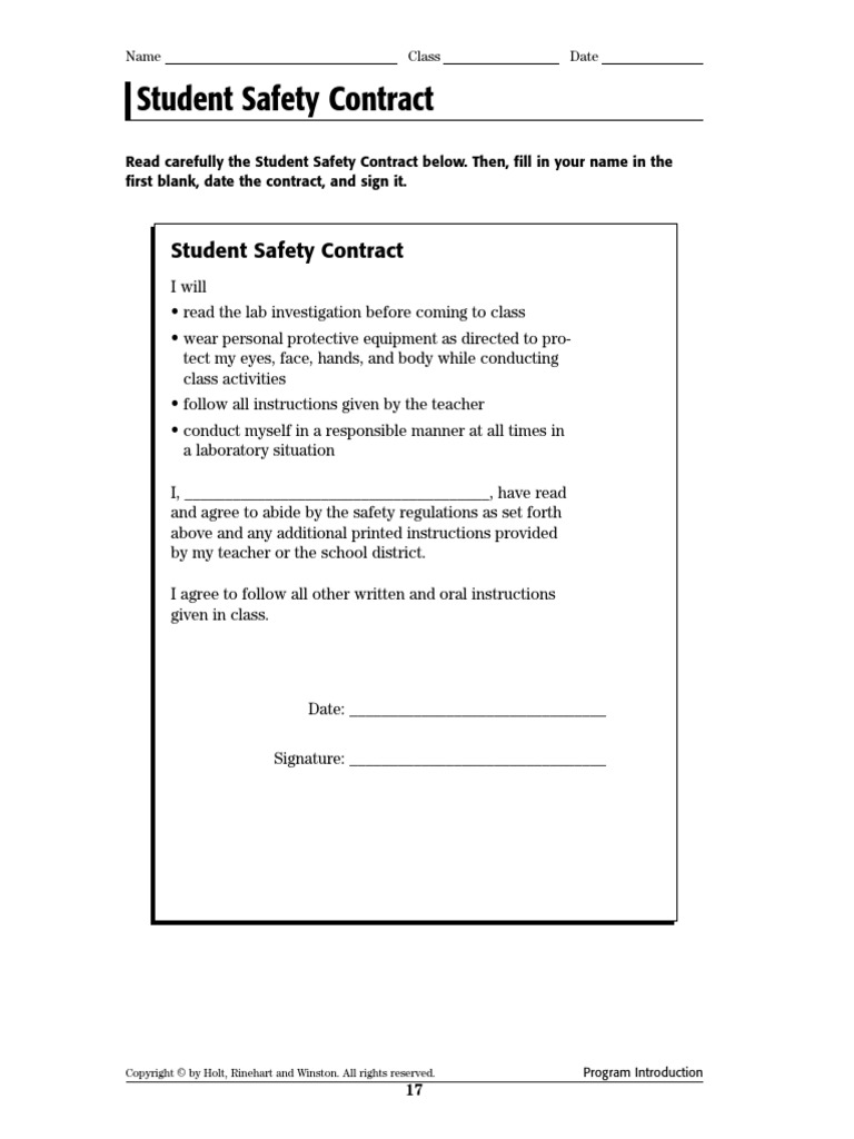 Read carefully the Student Safety Contract below. Then, fill in your name in the