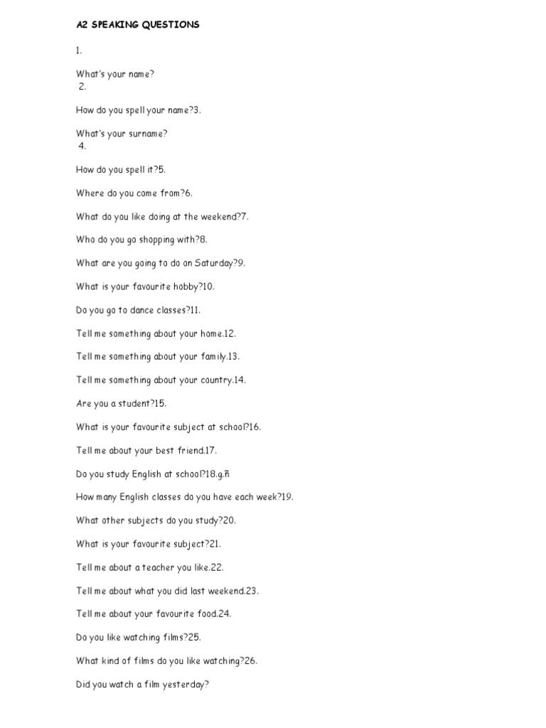 A2 SPEAKING QUESTIONS