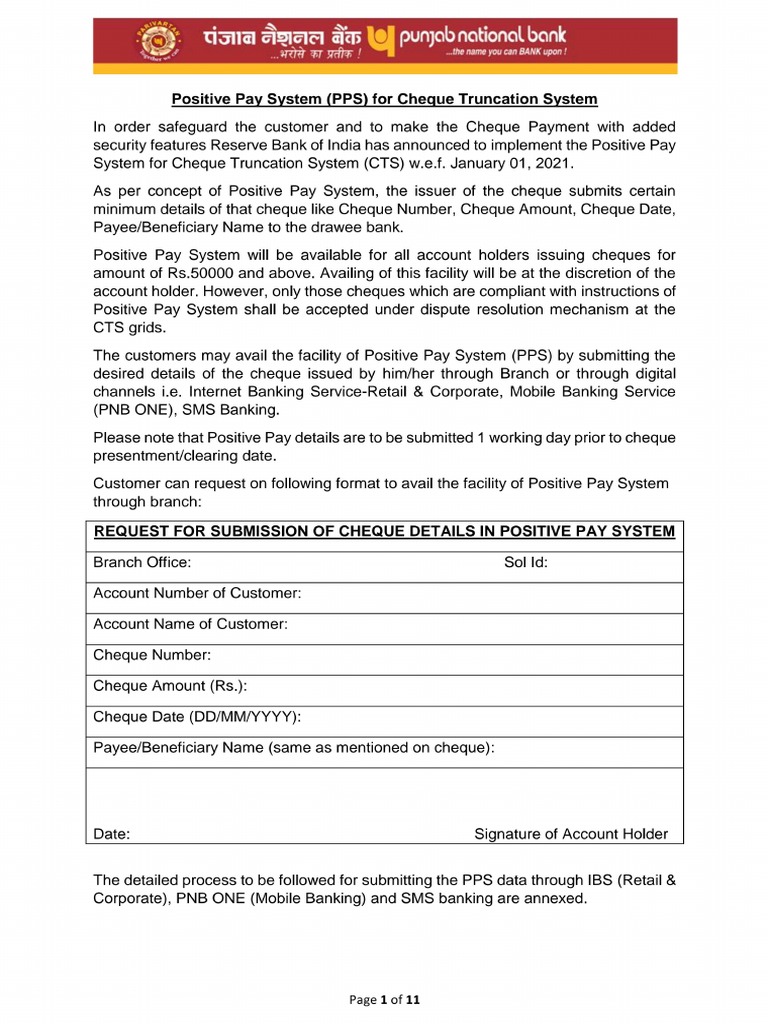 The customers may avail the facility of Positive Pay System (PPS) by submitting the