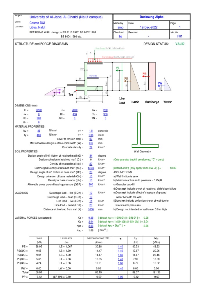 RETAINING WALL design to BS 8110:1997, BS 8002:1994. Checked Revision Job No