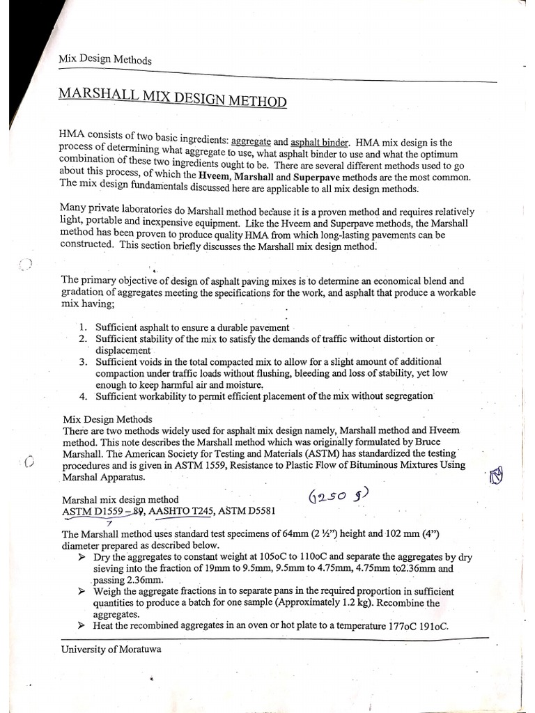 There are two methods widely used for asphalt mix design namely, Marshall method and Hveem {