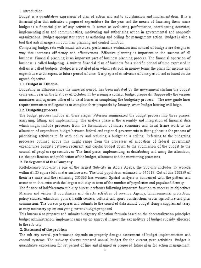 control systems. The sub-city always prepared annual budget for the current year activities. Budget is