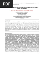December 2007. The amount was much in the months of 2008 as compared to corresponding months of 2007, and that is a reason for the volatility of the stock market. In 2008, the net buying is only Rs. 5,603 Crores compared to Rs. 36,869 Crores in 2007. From all this, we can analyze prime facia that the FII's influence market. A more investments by FIIs indicate that they are confident in Indian market. Usually, the mode of operations of FIIs was taking loans from countries where interest is low (like Japan) and invest in booming markets like India. include hedge funds, insurance companies, pension funds and mutual funds. The growing Indian market had attracted the foreign investors, which are calledForeign Institutional Investors (FII) to Indian equity market, and in this paper, we are trying a simple attempt to explain the impact and extent of foreign institutional investors in Indian stock market. What does the name FII means? It is the abbreviation of Foreign Institutional Investors. The term is used most commonly in India to refer to outside companies investing in the financial markets of India. International institutional investors must register with the Securities & Exchange Board of India (SEBI) to participate in the market. One of the major market regulations pertaining to FIIs involves placing limits on FII ownership in Indian companies. They actually evaluate the shares and deposits in a portfolio. The major source (almost 50%) of money the FIIs invest is from the issue of Participatory Notes (P-Notes) or what are sometimes called Offshore Derivatives. As on September 5, there are over 1484 FIIs and 38 foreign brokers registered to Securities & Exchange Board of India (SEBI). We are also examining whether market movement can be explained by these investors. We often hear that whenever there is a rise in market, it is explained that it is due to foreign investors' money and a decline in market is termed as withdrawl of money from FIIs. After 1991, due to our liberalization process, there was large flow of foreign funds from abroad. Current investments by FII is Rs. 2,55,464.40 Crores as compared to Rs. 2,83,468.40 Crores by the end of 31 December 2007. That implies that they had withdrawn almost 9% of money they had deposited till December 2007. The amount was much in the months of 2008 as compared to corresponding months of 2007, and that is a reason for the volatility of the stock market. In 2008, the net buying is only Rs. 5,603 Crores compared to Rs. 36,869 Crores in 2007. From all this, we can analyze prime facia that the FII's influence market. A more investments by FIIs indicate that they are confident in Indian market. Usually, the mode of operations of FIIs was taking loans from countries where interest is low (like Japan) and invest in booming markets like India.