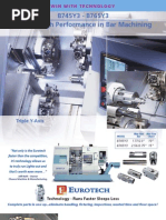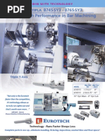 - 30-degree slant cast-iron bed - Cartridge spindles and air purge on both main and sub-spindle - Two 12-station servo-turrets - 192 tool capacity with SY-2 - EGS Tooling - Sub-spindle with B and E axial traverse - Clear-Shift sub-spindle - Polygon Turning - Sub-spindle, ejector, air blow and conrmation - Coolant system featuring 7-bar pumps and lters - Air conditioned electrical cabinet - Tool probing system - Bar-feeder interface - Chip conveyor - SBS tool load monitoring system - Eurotech GAP ELIMINATION software - Tool Life Management - Color Graphics Screen with 10.4 Color LCD - Full Keypad with Custom Touch Keys - Macro A & Macro B - RS232/PCMCIA Interface/Ethernet - Extra Memory - Eurotech EASY CYCLES - Programmable parts gantry and conveyor system for the main and sub spindle, capable of catching remnants and reverse dropping them o the parts conveyor. - G54-G59/G80-G89 - High Pressure Coolant with Filtration System - G10 Programmable Input - Live Tooling Package - Standard Tooling Package - Air Conditioned Electronics - B-Axis Stress Control on Sub-spindle - Fanuc 31i-T Series three channel control - Unexpected Disturbance Detection (Air bag) - Eurotechs Servo Turret Set-up Check - Live Tools from 2,000 to 60,000 RPM available - Virtually Zero Chip-to-Chip Tool Change Time - Disc Brake on Main and Subspindles - Finished parts conveyor - Scale feedback on the Main and Sub-spindle C-axes, and Heidenhein scales on the E-axis