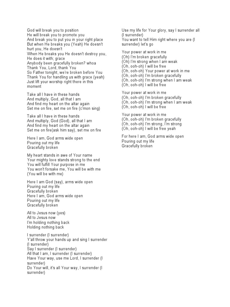 Anybody been gracefully broken? whoa (Oh) I'm strong when I am weak