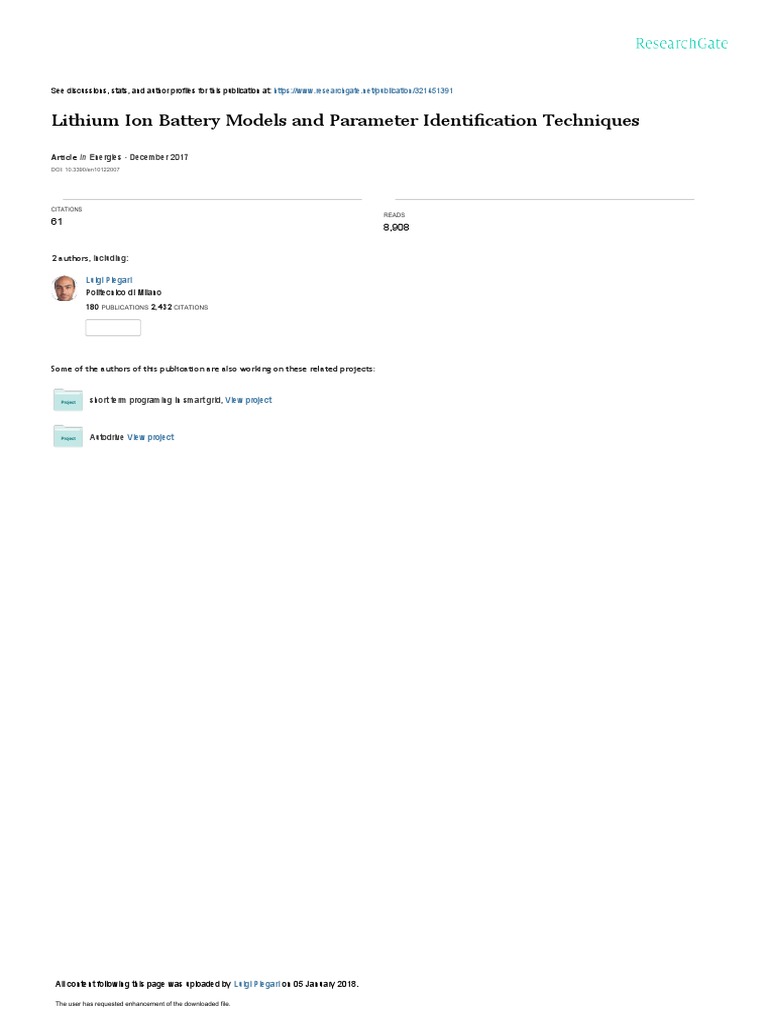 Keywords: battery modeling; lithium ion battery; storage system; parameter estimation