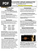 Reminder: The Library will be CLOSED Saturday, August 27 for Hay Day. Hay Day Book Sale Saturday, August 27 Our Friends group will be sponsoring their 4th Annual Giant Book Sale on Hay Day! Officially, the sale starts at 9:00, but get there early for the biggest selection. New Library Hours Please note these important changes in our hours. The library will be open on Thursdays from 12:00-5:00 PM and CLOSED on Fridays. Library Cards We are now scanning barcodes on library cards at the checkout desk. Please remember to bring your card with you when you visit the library so everything will go smoothly. DVD Checkouts In order to meet the increasing demand on our DVD collection, DVD loans are now limited to one week (7 days) with no renewals. DVD late fees have increased to .25 per day. This will allow everyone a better opportunity to borrow our new releases. Library Program Meeting Space Patrons, please remember that the Goodwin Library holds many programs from 6:00-8:00 PM on Monday and Wednesday nights at our big conference table in the Non-Fiction/Public Access Computer Room. If you need quiet time at the computer during this program time, please bring or ask for headphones. Thank you for understanding our space limitations. Staff Picks and Patron Picks Bookmarks Looking for a good read among our many new books? Check out our Staff Picks bookmarks. Our staff has a wide variety of reading tastes and with these bookmarks, we can recommend our favorite titles to you. Did you just finish a great read that you want to recommend? Grab one of our new Patron Picks bookmarks from the bookmark rack and share your enthusiasm with other patrons. Friends of the Goodwin Library Meeting Wednesday, August 10th at 6:00 PM If you are interested in finding out more about the Friends, you are welcome to attend. Applications to become a member of the Friends are available at the library and available on the Friends blog at www.goodwinlibrary.com.