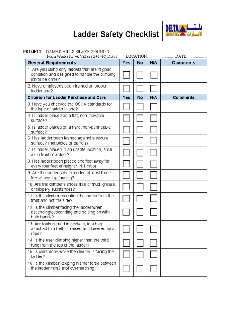 Criterion for Ladder Purchase and Care Yes No N/A Comments
