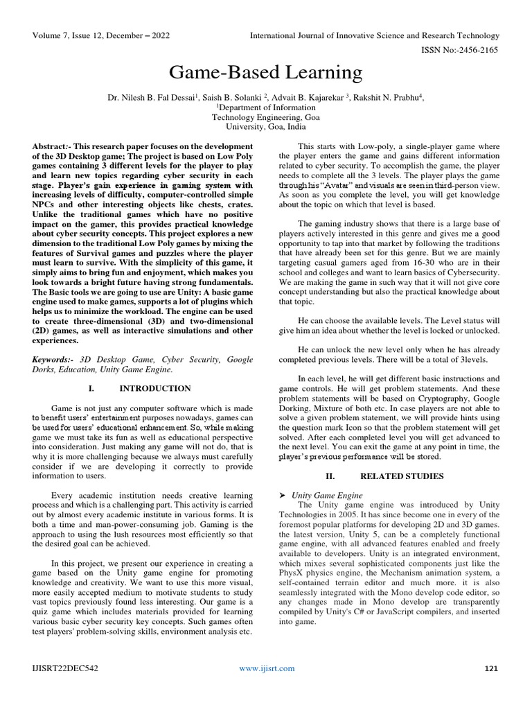 Keywords:- 3D Desktop Game, Cyber Security, Google completed previous levels. There will be a total of 3levels.