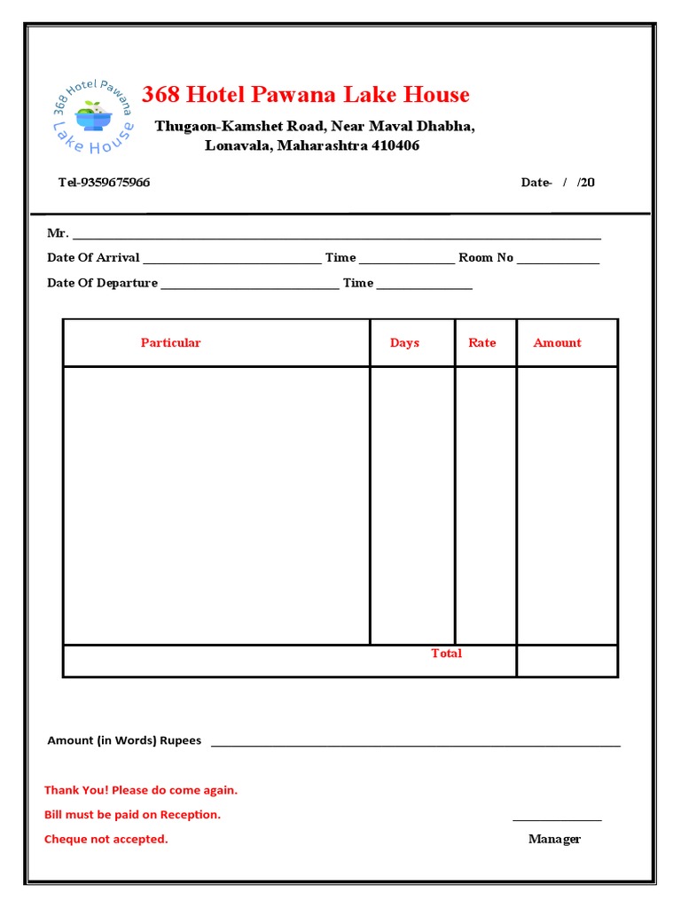 Date Of Arrival __________________________ Time ______________ Room No ____________