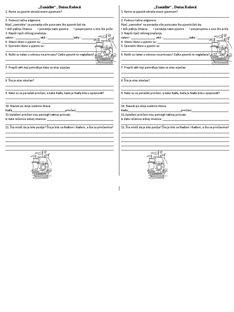 4. Glavni likovi u pjesmi su: __________________________________ 4. Glavni likovi u pjesmi su: __________________________________