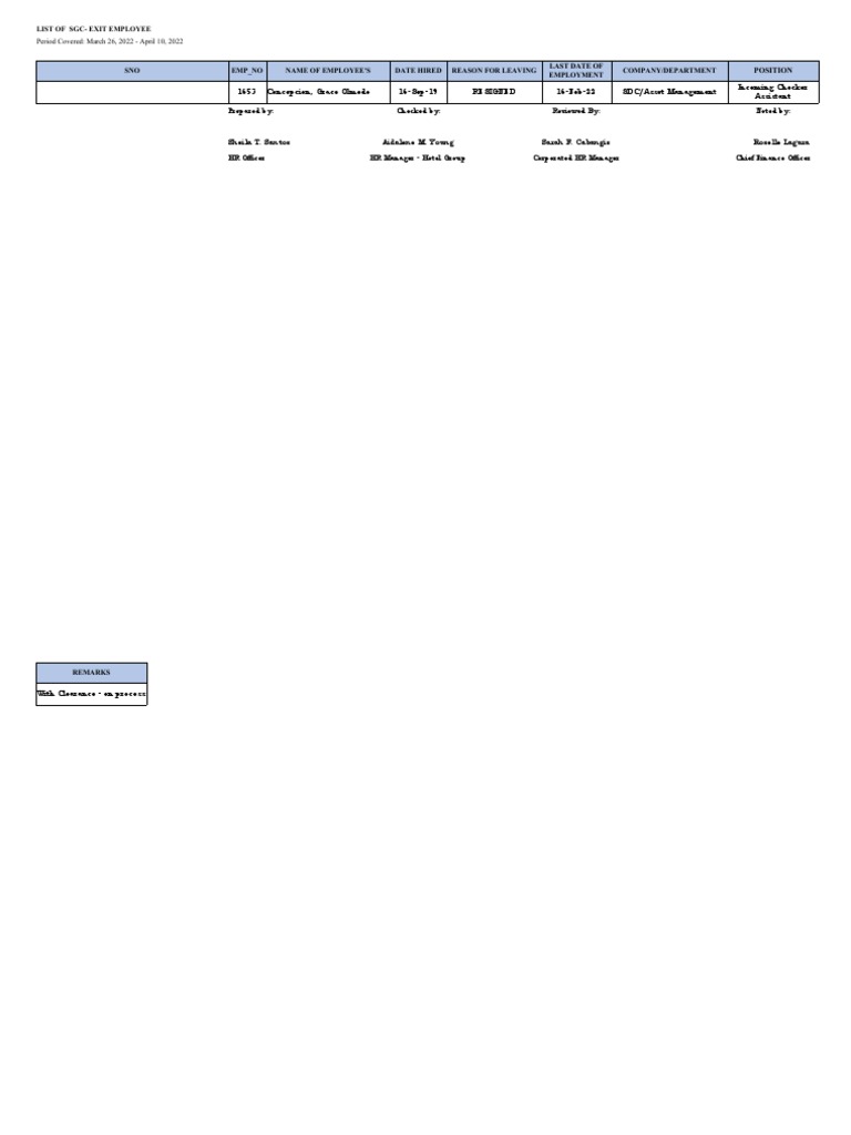 ### ### Espinosa, Joselito Reyes 14-Dec-20 Resigned 2-Mar-21 SGC-H99 Accounting Officer No Clearance Yet