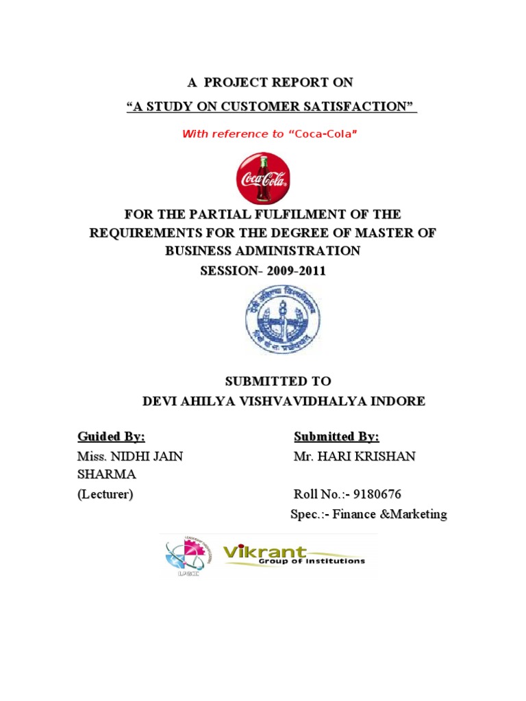 industrial scenario. Being a Perfect Competition Condition in market not only the selling of product one time is sufficient but also the retaining of customer for long time also required and for retaining the customer, satisfaction of customer is the most important avenues. Therefore every marketer is looking for the things/methods/techniques by which he can satisfy the customer of his product. That is why Study of Customer Satisfaction is emerge as a very important part of Marketing. Being a part of young generation I also want to work on some special Products like soft drinks which is very famous among youth. Hence I choose Customer Satisfaction with special reference to Coca-cola (famous as coke in Market).